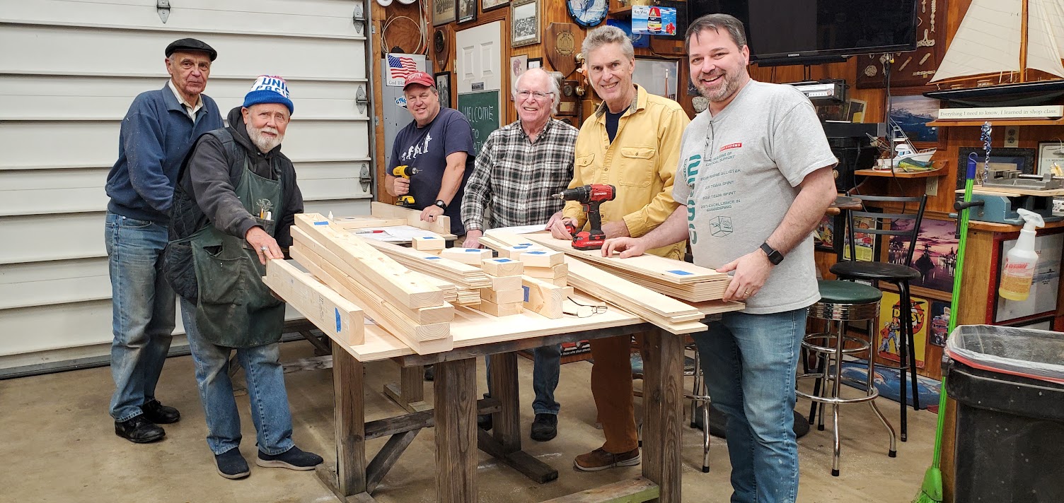 Terry Nienaber testing the teeter-totter balancing platform built by the TWWWG for high school robotics teams to be used in the 2023 FIRST Robotics Competition. TWWWG members at Pat Lester's home shop, building a balancing platform for FIRST Robotics teams.