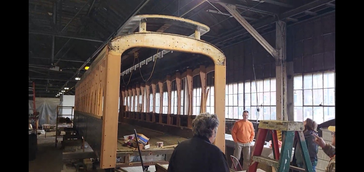 Scott Paris, standing next to the Hampton streetcar in the restoration facility at Fort Monroe. Editor |