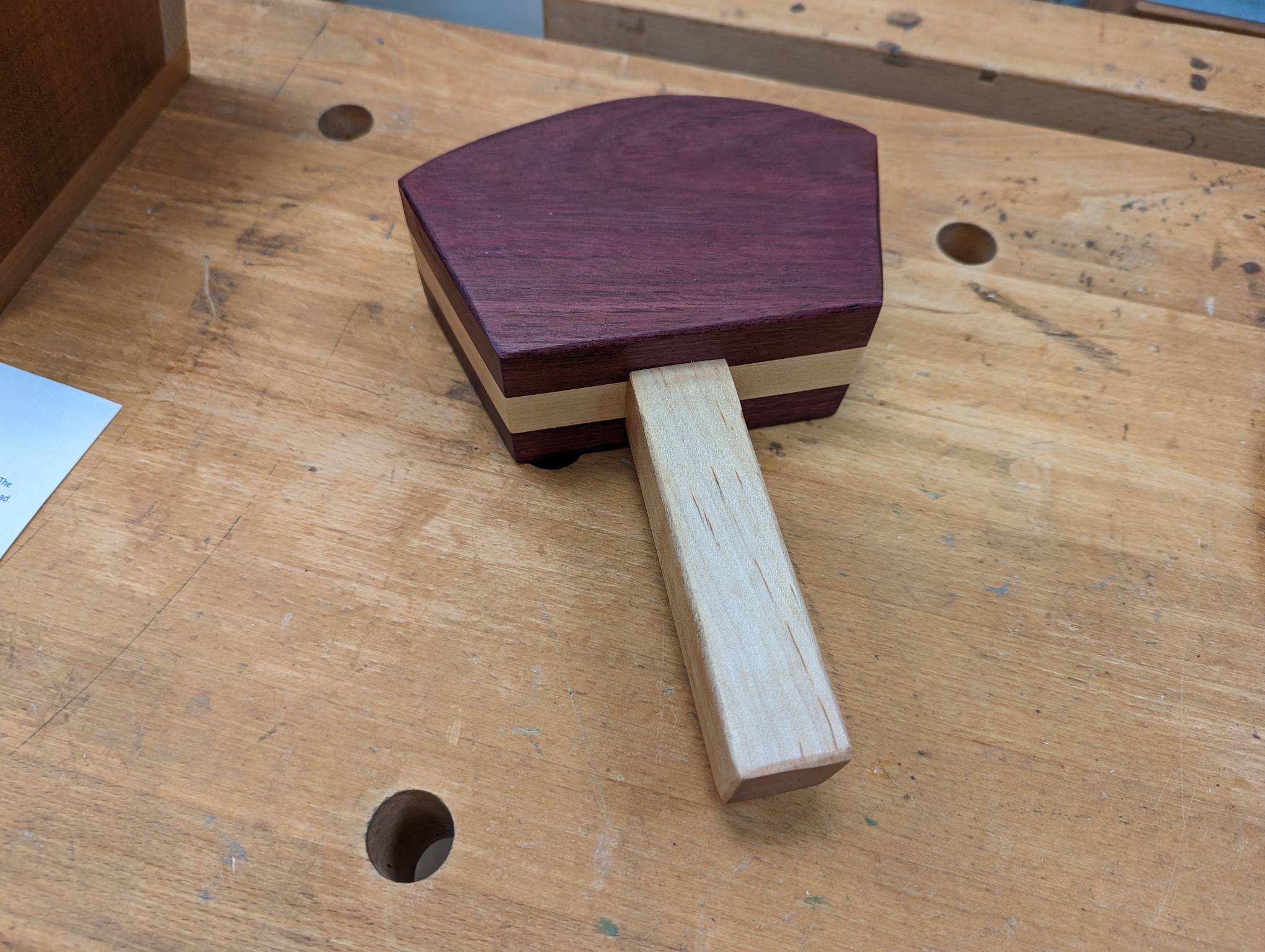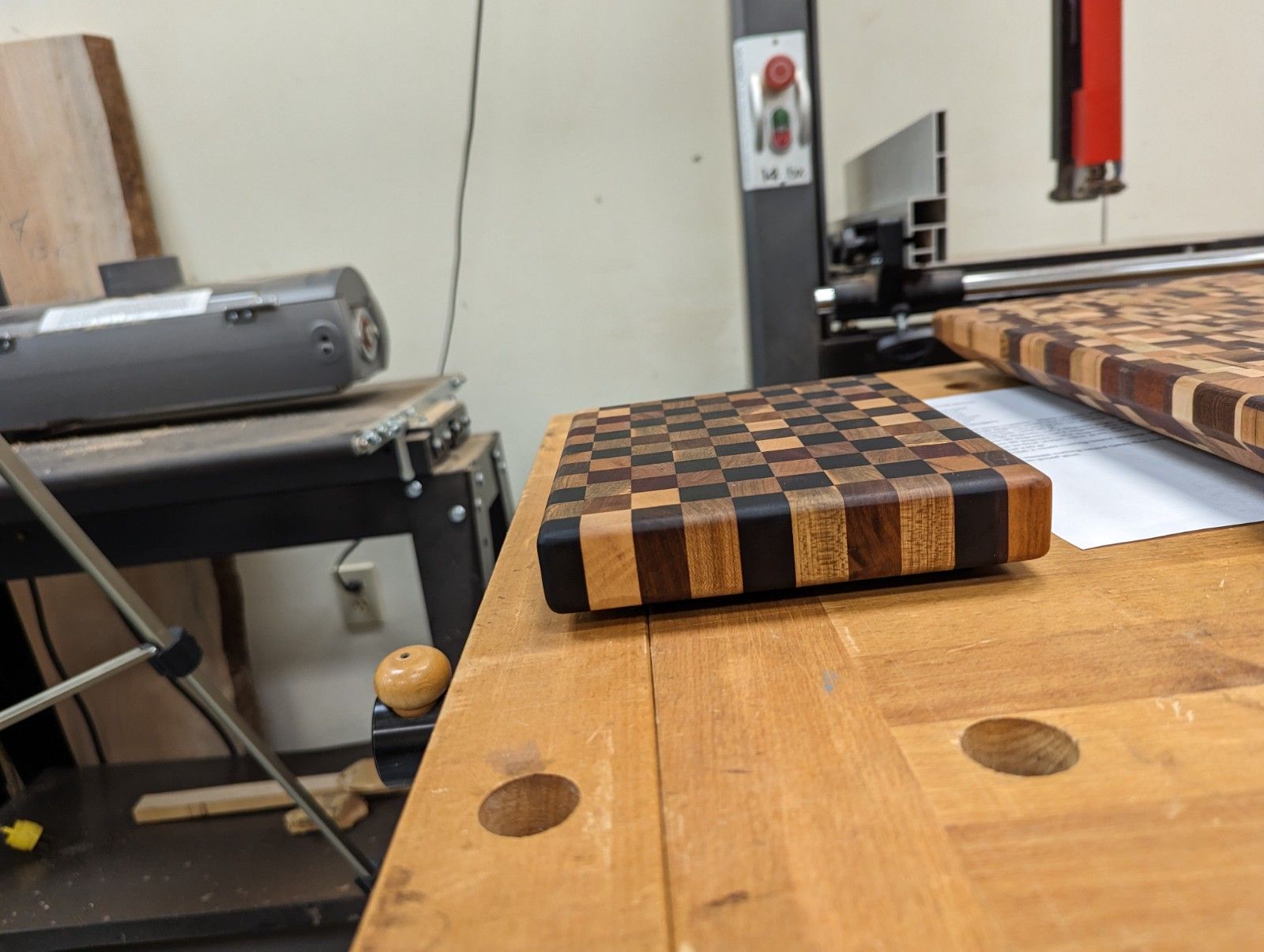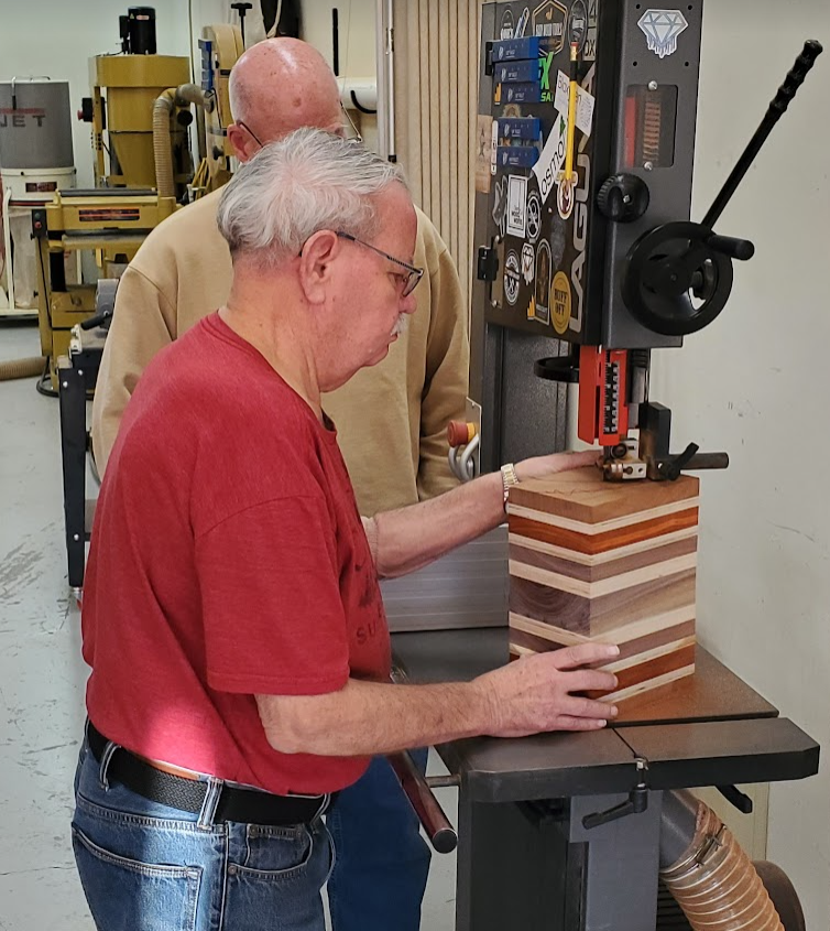 Benchtop Talk: Challenges For WoodworkersTWWWG members met for an informal benchtop discussion on April 10, 2023. The only stated objective for the meeting was an opportunity for members to present work they’ve performed or challenges they are experiencing. Not all discussions were captured, but below is a summary of some of the bigger topics. Gary Stephens showed a thick block that had been glued up from contrasting colors of scrap wood, which he intended to cut into a gradual curve as part of a knife block. He asked for suggestions for cutting such a thick piece of wood with a gradual curve, which was too thick to cut in his bandsaw. Consensus was that it would be easiest to do on a bandsaw that has an extension block for resawing. Alternatively, it could have been cut as two pieces before gluing up. The cut was performed later in the gathering on the saw in the classroom.