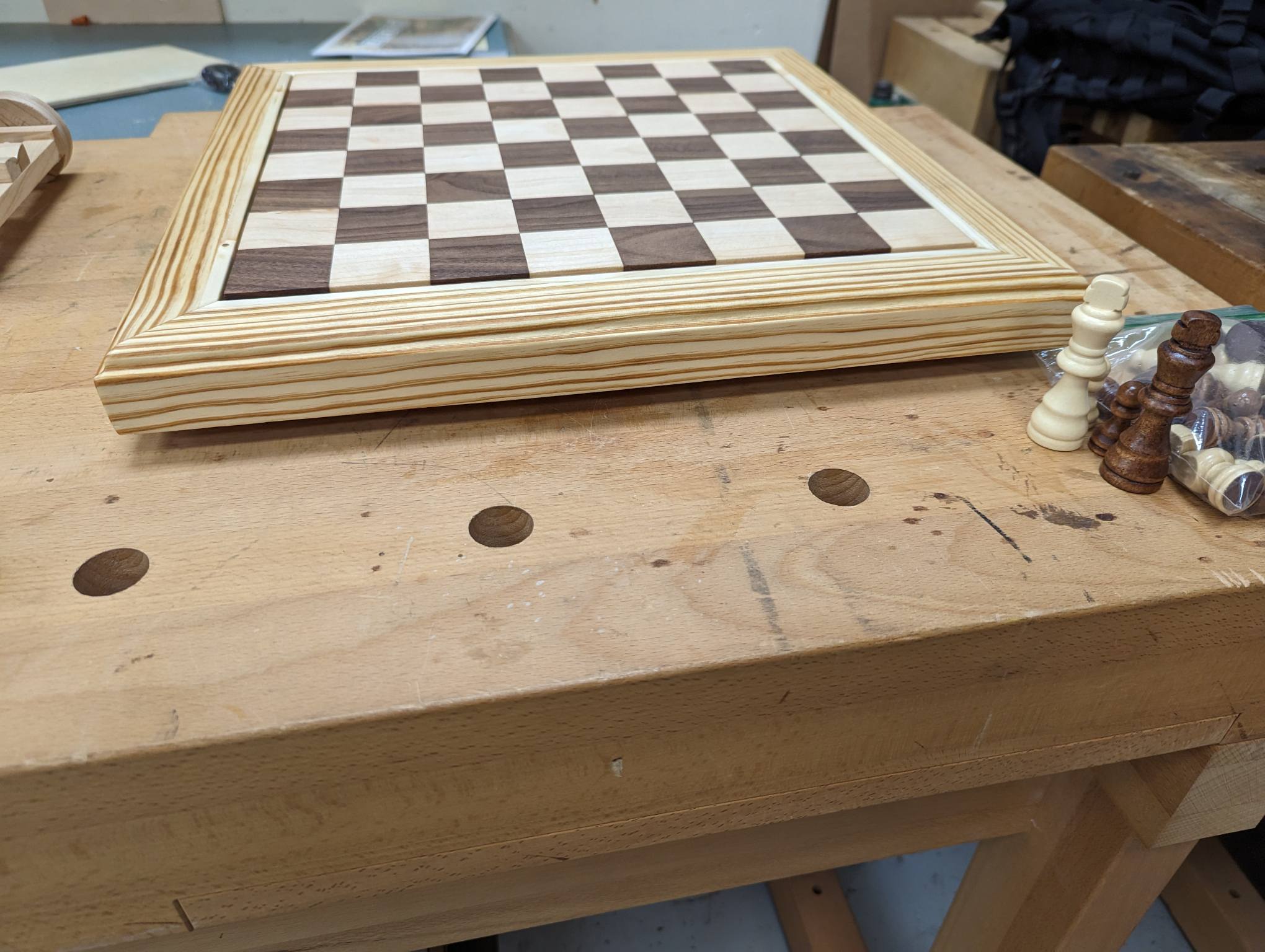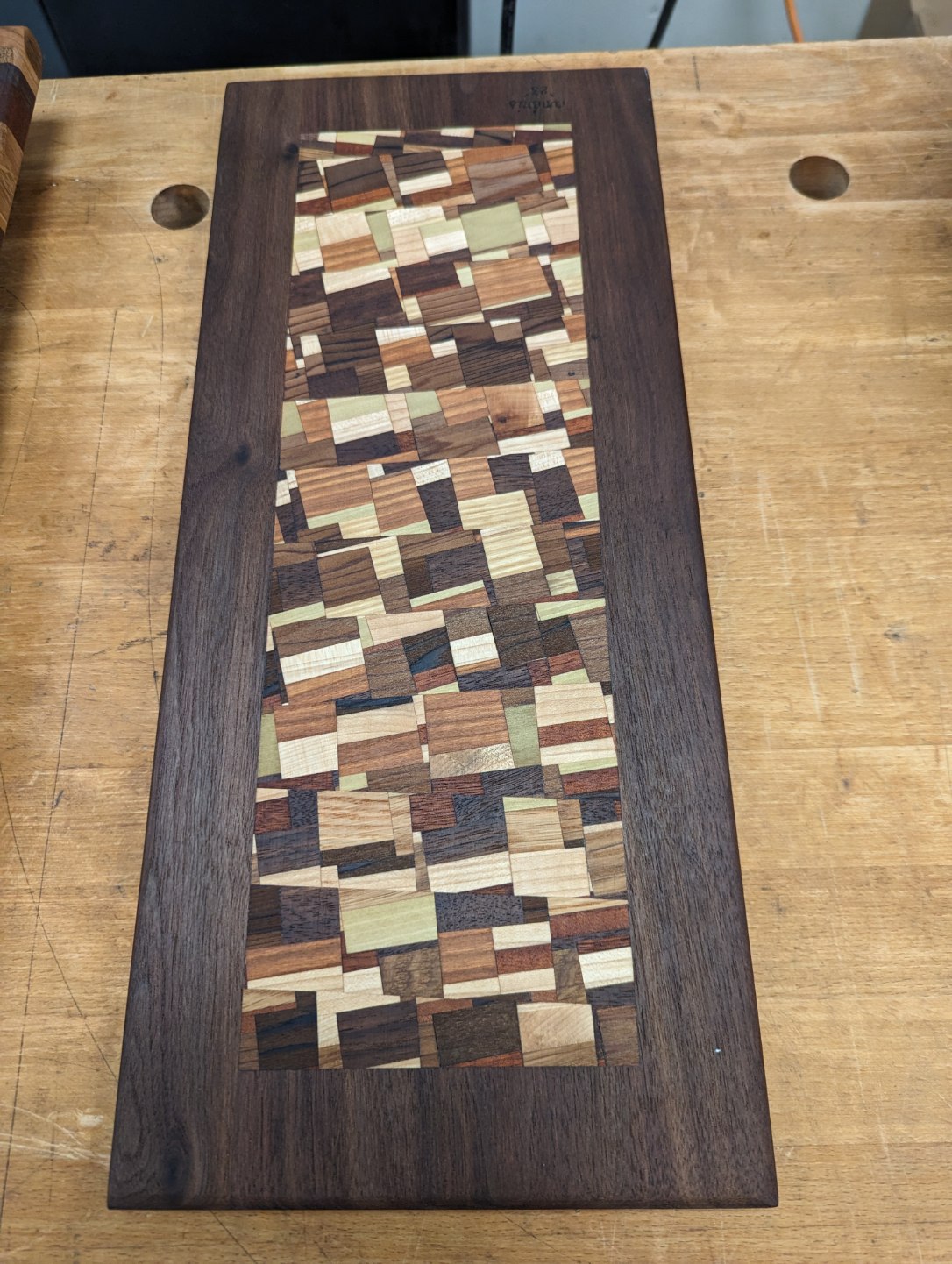 Ryan Evans shared follow-up experiences and research after last month’s presentation. He recommended a video online by YouTube content provider, Katz-Moses with test-derived recommendations on how often to sharpen tools, and how the angle of the bevel (among other parameters) influence how often to resharpen. Chris Zuchristian showed an epoxy-filled tabletop for an end table he is currently making. Chris asked for recommendations on how fine to sand to improve the appearance of the black epoxy and what finish might be appropriate. Recommendations included sanding to around 320 grit (which he had done) with the random orbital sander he was using, and following up with linear (manual) sanding patterns in the direction of the grain. Depending on the finish desired, which in this case is a rustic look, a rougher grit of 240 can be appropriate prior to the first coat, depending on the recommendations from the finish manufacturer.