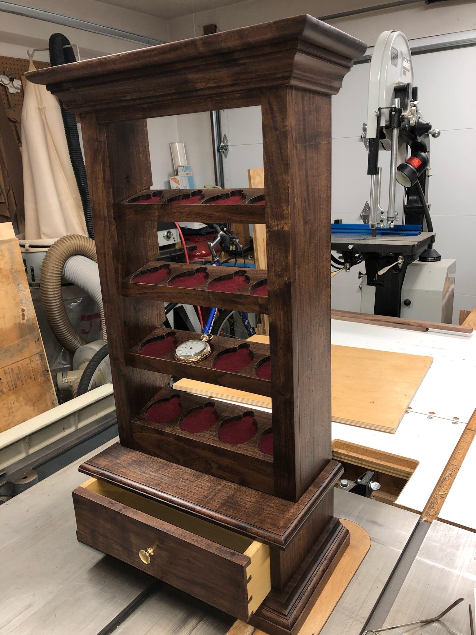 The project below, a pocket watch holder, was originally credited to Jim Francis but actually belongs to Bret Lancaster. The picture was on Jim phone, forwarded to my wife's phone and then eventually sent to my e-mail account. We will look for a description of the project in next months newsletter from Bret.