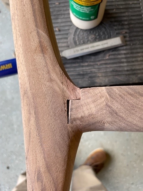 Building A Sam Maloof Rocking Chair Part VWith the cold weather we have had the past month or so, I have not been out in the shop much. Plus I also had a couple other projects going on such as the scrap wood challenge. But I did do some more shaping and sanding on the seat and legs to get ready for the final glue up of the seat and legs. So after a little bit more refining during the past month or so, I found some warm days when the temperatures got into the 50’s where I could do a glue up. Yes, the front and rear legs have been glued and screwed into place. So you can actually sit in it now. I used Titebond III for this part of the glue up and as you may know, the glue and pieces of wood need to be above 40 degrees. We didn’t have a lot of weekends in the upper 40s, so when I saw the potential for 50 or better temps one weekend, I took all the parts and the glue inside for a few days to at least get to room temperature and then took them back to the garage for the actual glue up. So I guess that is a milestone accomplished as there is no going back now. Unfortunately, with all the putting together and taking apart and moving pieces around here and there I got some damage at a couple of places. Nothing any woodworker would like to talk about, but as I am sure all of you have had a project where a little chip here or there happened. So I thought I would share a couple of the repairs I had to make as part of the final assembly of the legs and seat. Below are a couple pictures showing where a small chip of wood was knocked off of one of the tenons. The one on the left is the side of the rear seat on the right side. The one on the right is the back of the seat where that tenon joins with the rear leg. So to fix these I had to find some scrap that had similar color and grain to the missing pieces. The other problem is that these two repairs are going in different directions. The first photo, the grain is going horizontal to the seat. The second repair, the grain is actually going into the seat (back to front), so you are dealing with end grain. Obviously if you notice the damage when it happens and can save that chip that came off, it will make your life and the repair a lot easier. But if you can’t you’ll need to use a piece of scrap. So you will want to save whatever scraps you can until your project is complete. Particularly if you are dealing with wood that has variations in color and figure so you have more options. Anyway, below are two pictures showing the repairs for each. I spent the last weekend or so cleaning up the glue squeeze out and getting that final blending of the seat to the legs. Next will be more sanding of the seat and leg joints. I want to get these areas sanded to at least 220 before I add the arms as it is a lot easier to sand and move around without the arms attached. So hopefully for the next issue, I’ll have the arms attached and possibly the head rest and spindles attached and sculpted. Scott Paris |