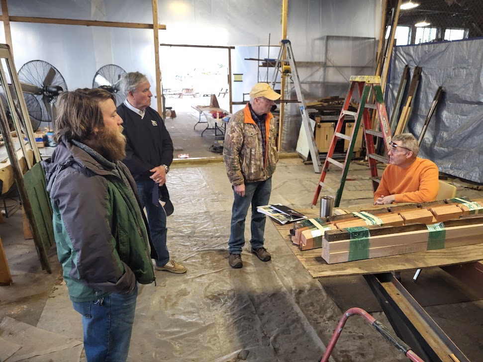 TWWWG Street Car UpdateProgress continues as members of TWWWG help reconstruct the wooden components in the streetcar being restored at a facility in Fort Monroe. Jim Francis is leading the guild effort, evaluating what information or templates are available, ordering materials, and parsing out work to be performed by other guild members. A large order of cherry lumber has been received and delivered to the streetcar, with thanks to Woodcraft for helping with the order. Tim Roach finished drawings of the bifold door. Jim began a prototype panel to develop the process and think through how to divide up work going forward. Photo of TWWWG members delivering parts needed to reconstruct portions of a curved wall on the Hampton streetcar.