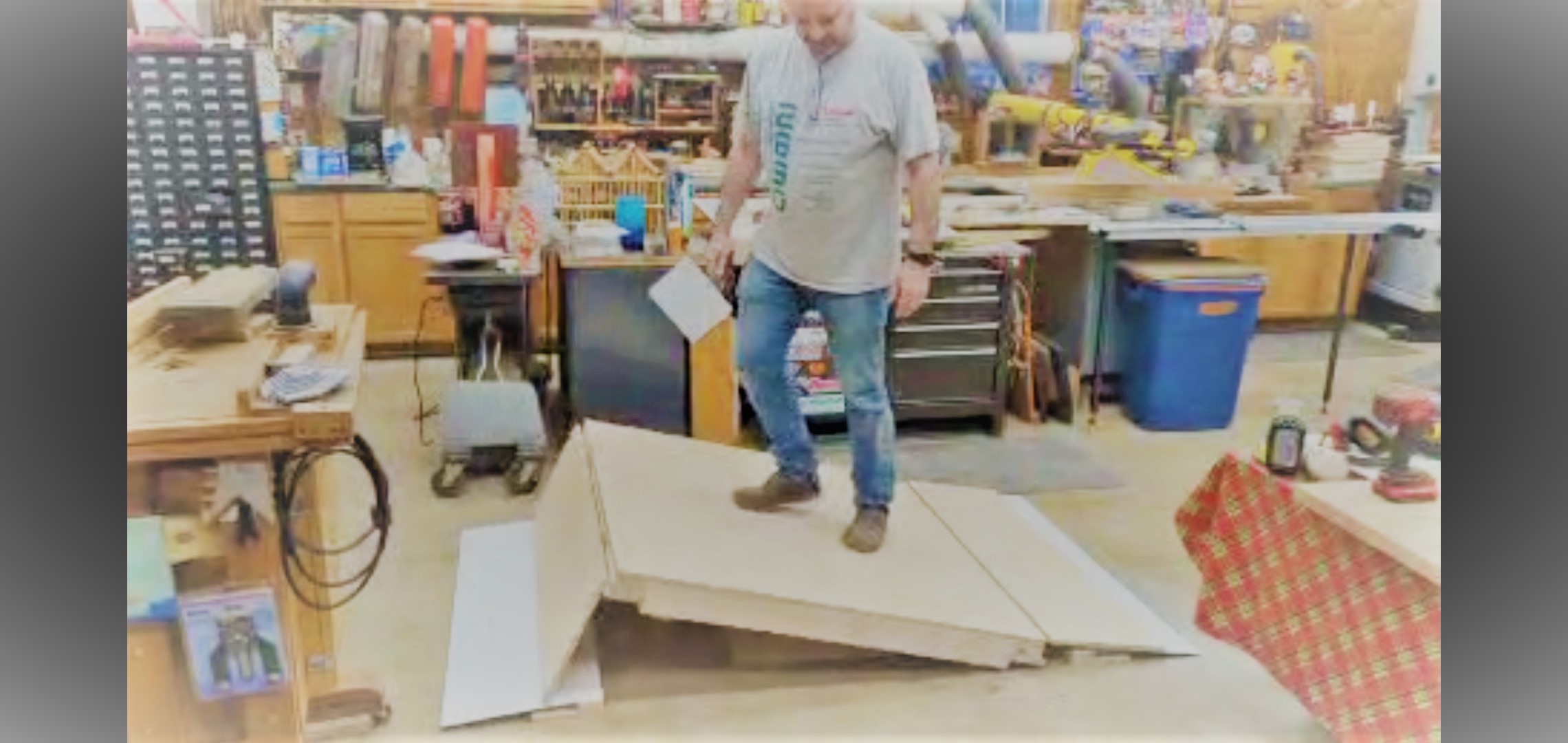 Terry Nienaber testing the teeter-totter balancing platform built by the TWWWG for high school robotics teams to be used in the 2023 FIRST Robotics Competition. TWWWG members at Pat Lester's home shop, building a balancing platform for FIRST Robotics teams.