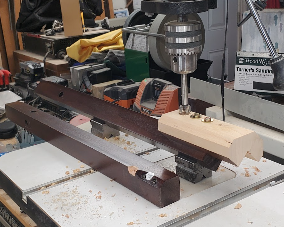 Chris also showed a recent example of an engraved board with a detailed inscription. He asked for advice on preparing the wood and backfill techniques and colors. Given the range of light and dark colored boards used across the width of the piece, one of the members recommended silver to provide a compromise to contrast between both. Also recommended was to fill grooves and pits in the grain with epoxy or finish to make the lettering appear crisp. Bob Hodges provided an update on his efforts to set up his computer numerically controlled (CNC) router. He acknowledged a large learning curve on both switching from a Mac operating system to Windows, and in learning the CAD and programming software (V-Carve). More to come. Bob also talked about his and his wife’s experience in creating a sales website for displaying and selling his wife’s artwork. They currently use a content management service, artstorefront.com. The service aids in website creation, hosting and sales, as well as marketing. He was complimentary on how well it worked. Terry Nienaber talked about a fixture he made to drill and install a new insert in bar stool legs to shorten them, adjusting their height without significant changes to the tapered shape of the legs at the bottom of the stool. He was able to take an inch off the length by making a template to carefully move the holes on each of twelve legs using fixture he could secure in the old holes and drill new prior to sawing the top off. |