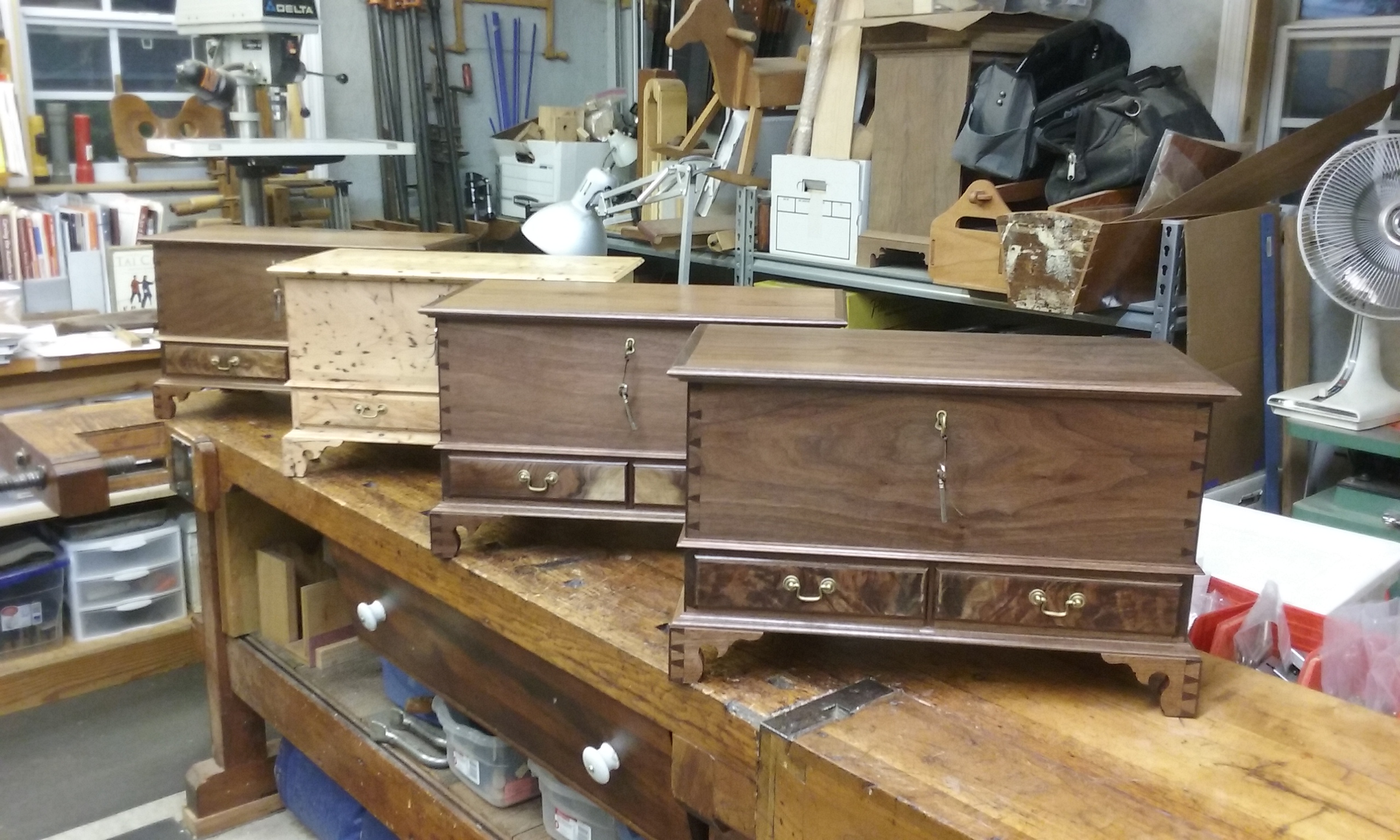 Guild Woodworking ProjectsOur first projects for this month’s newsletter comes from Jim Francis, somewhere near the Arctic Circle in an area called Wyoming! Furniture Heading West It's been a busy spring/summer in the shop to support friends and relative weddings/anniversaries/special occasions in Wyoming and Colorado. Shown are four Pennsylvania style keepsake boxes; three of black walnut, and one of wormy pecan harvested locally. In addition, there's a Pennsylvania style spice box of black walnut with two secret compartments (false bottom in the center drawer, and one behind the rear panel). The secondary woods are pine, poplar and cypress. There are a lot of dovetails (the boxes themselves, drawers, keepsake box feet and the tray inside the keepsake boxes), as well as mortise/tenons (keepsake box breadboard lid and spice box door frame). Also, with both box types there are all sorts of possibilities for personalization; carving as well as inlay. As an example, shown on the inside of the spice box door is an interesting design executed with holly stringing.
