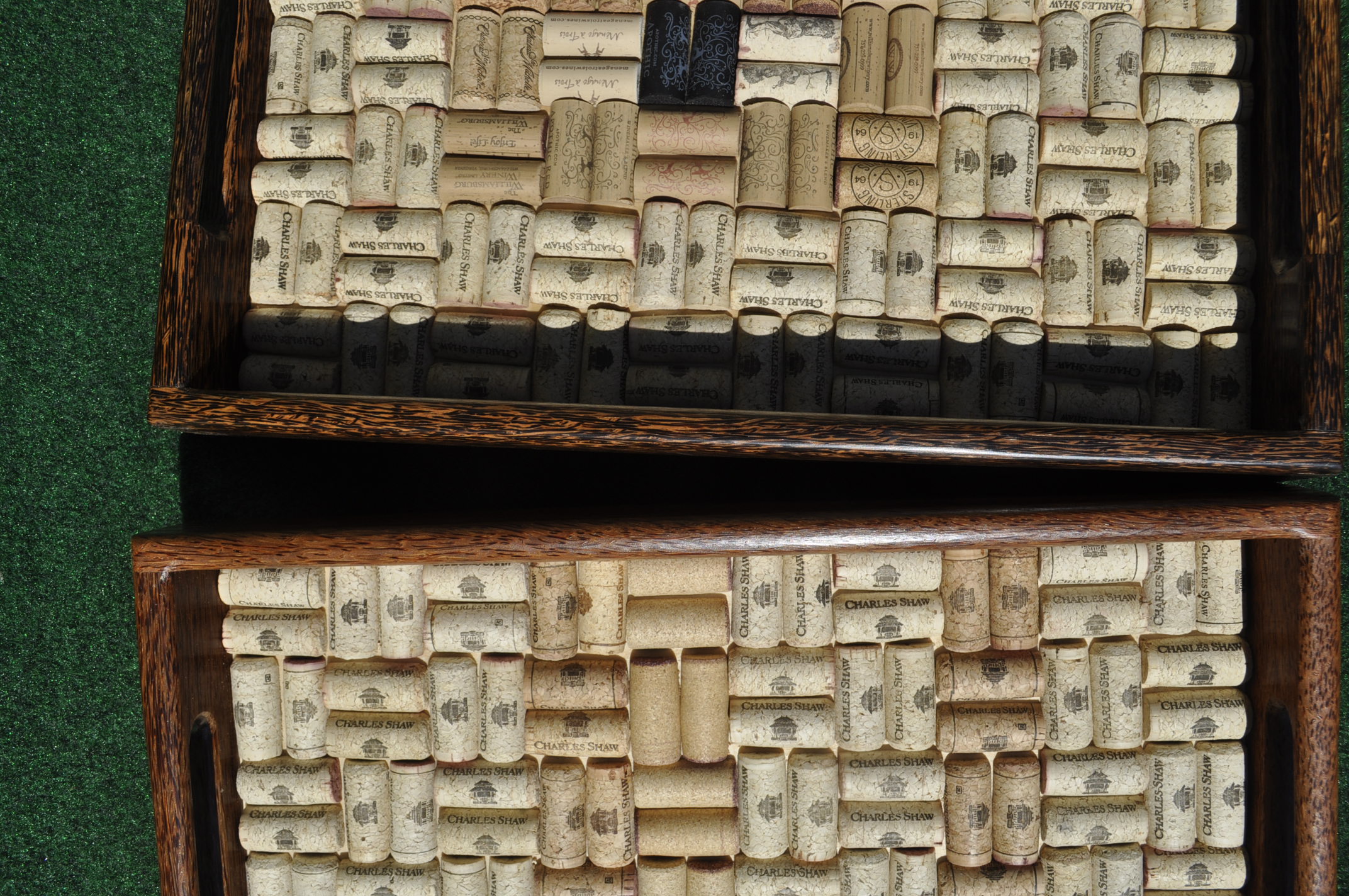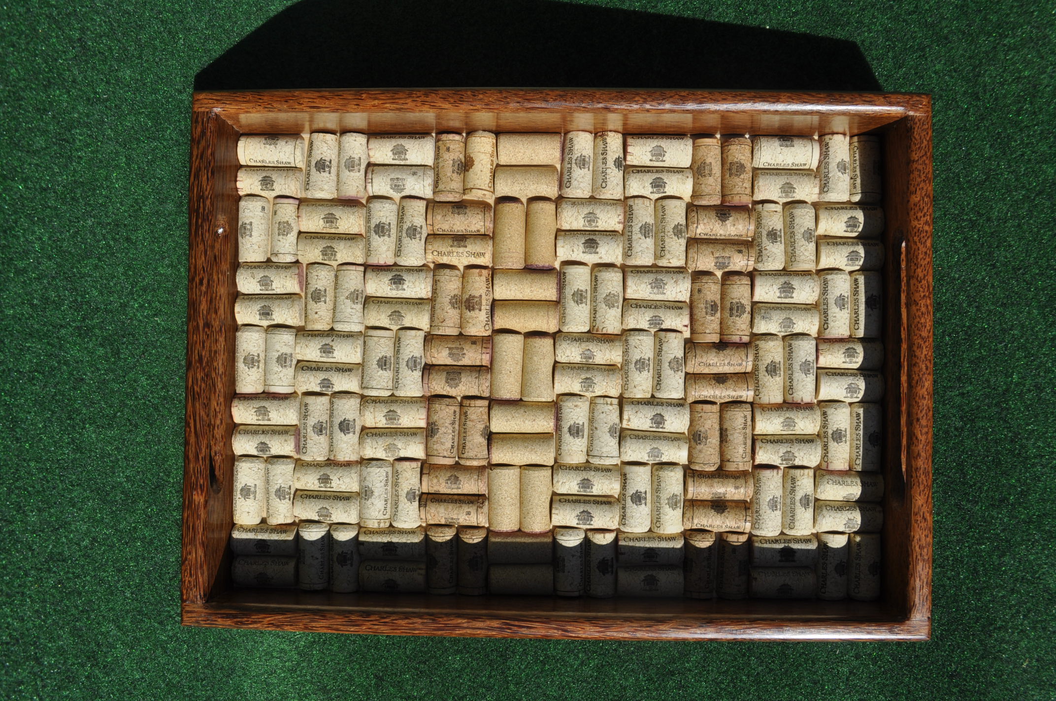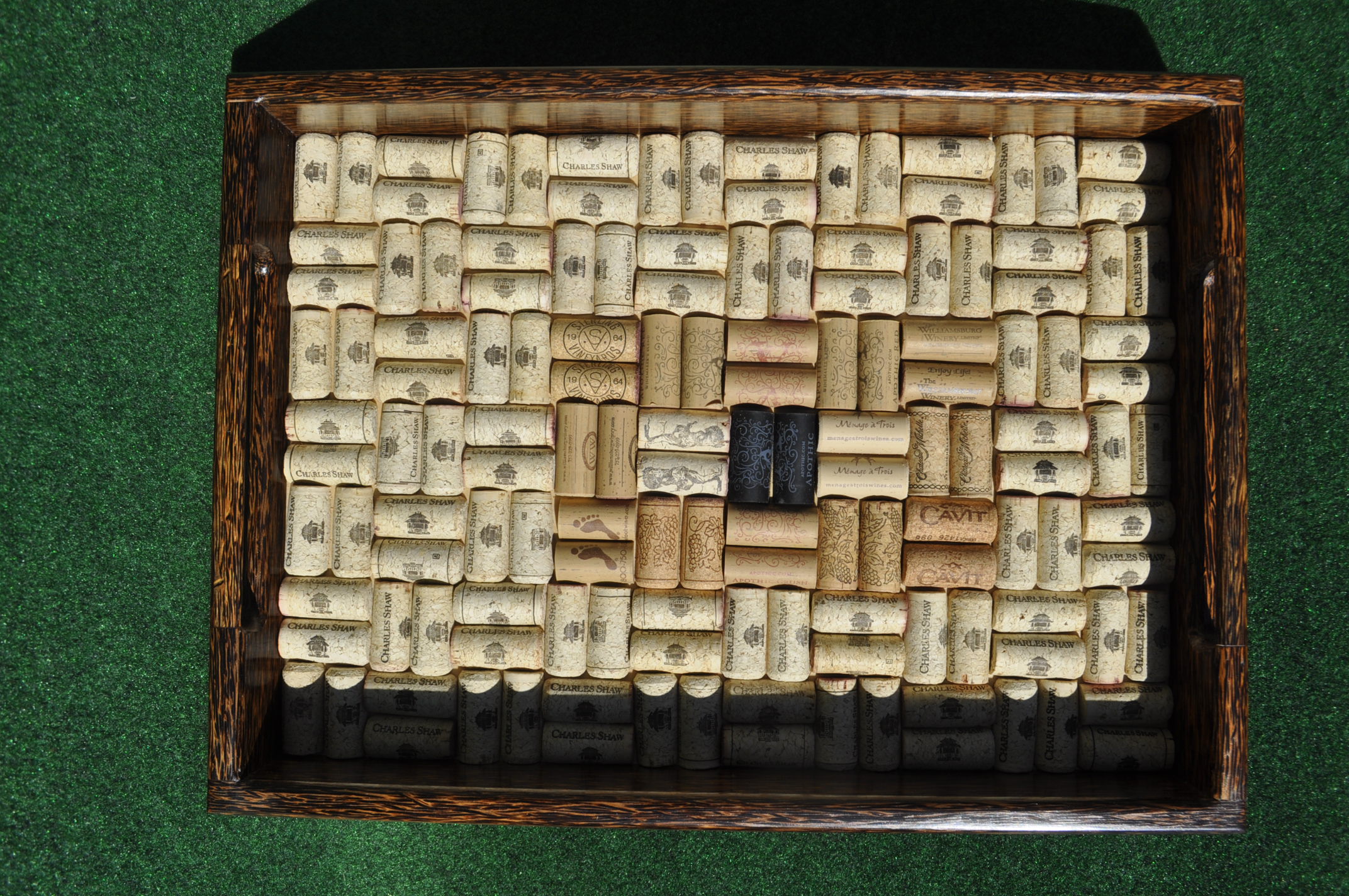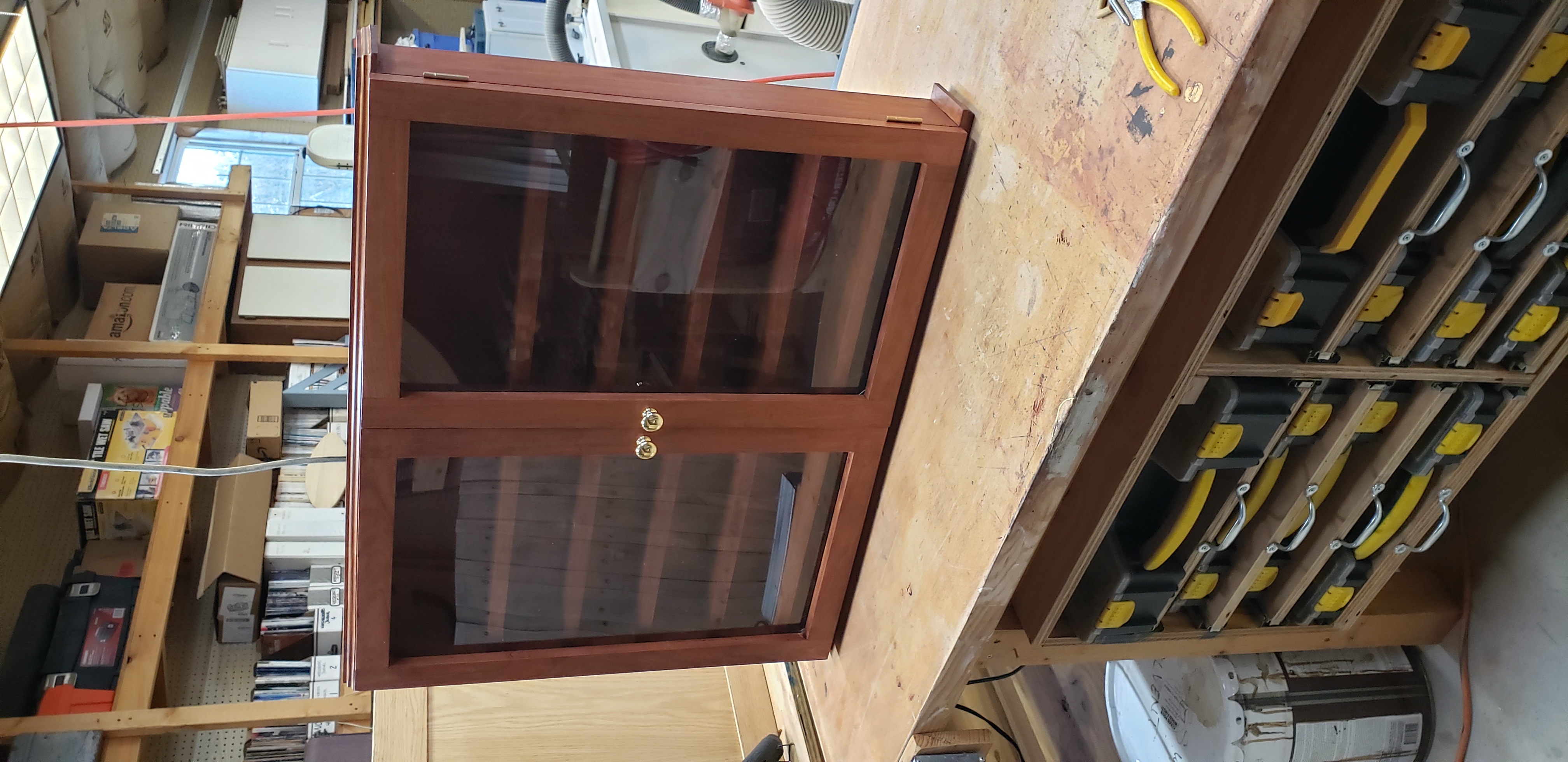 At first glance this wooden cross looks very complicated but it is really simple. The back of the cross is just a piece of plywood that I used to secure the small parts. While it looks like a lot of parts, there are only two sizes of parts that I had to work with. The four squares on the cross are 2 ¾” square and placed on the cross in a 45 degree orientation. All of the other parts are the same, 2 ¾” long by 1” wide with a 45 degree cut on both ends. The small parts were easy to mass produce. The most tedious part of the project was the gluing of the small parts to the plywood backing. It was very hard to get them aligned up properly as they always wanted to move because of the glue surface. Palm Wood Serving Trays With Wine Cork Bottom Black Palm Wine Cork Serving Tray Red Palm Wine Cork Serving Tray In the November 2020 edition of the TWWWG newsletter I did an article on Red and Black Palm “wood”. While the palm wood grows on trees is neither a hardwood or softwood but a monocot or grass. I used finger joints on the ends to give the serving tray a look of special look. The finger joints were easy to make on the table saw but I found the “wood” to be very splintery and I had to watch out for splinters in my fingers. Working with the palm wood was different from normal hardwoods or softwoods. When cutting the finger joints on the table saw my sweat shirt that I was wearing looked like a porcupine sprayed it with hundreds of tiny splinters. When routing the curved edges of the serving tray it sounded like WWW III as the "wood" came off in long splinters and I thought it was going to destroy the wood. After turning off the router I found that the finish on the "wood" was very smooth but full of small splinters. Black Palm (Left) - Red Palm (Right) The palm wood sanded very smooth and almost felt like you were rubbing your hand across a piece of glass. I used General Finishes semi-gloss Arm-R-Seal for the finish. The finish came out beautifully and at first glanced the wood looked like a highly polished piece of plastic that was very smooth. The bottom of the serving tray is covered in wine corks that I split down the middle using my patented (Patient #TWWWG2021GLS) bandsaw wine cork jig. I was amazed at how many corks it takes to cover the bottom of this serving tray. The interior of the serving tray is roughly 18" x 13" and it takes 140 corks to cover the bottom. I will need to get back to drinking more wine during this pandemic! The next project comes to us from Larry Cameron. Cherry Shot Glass Cabinet