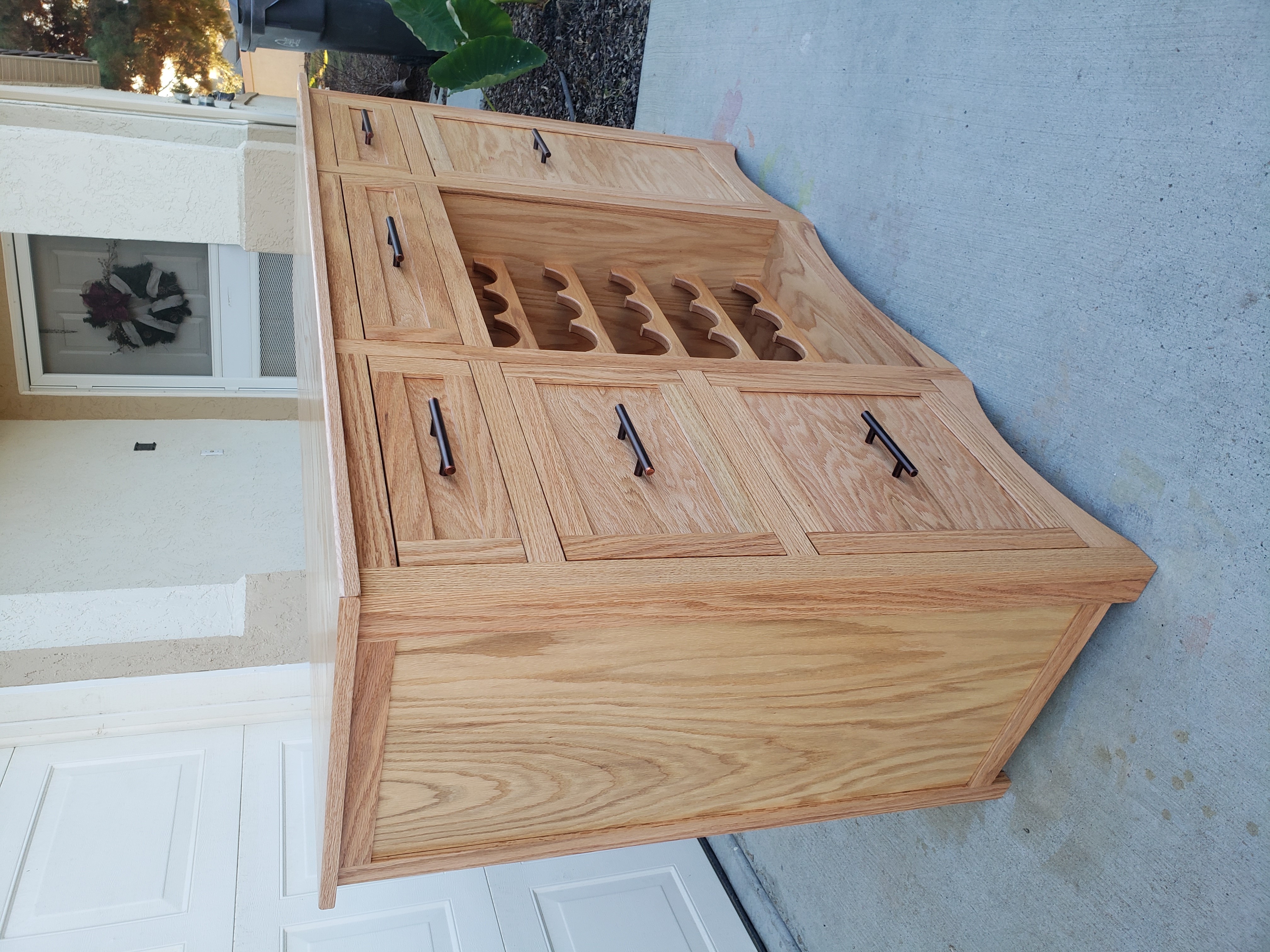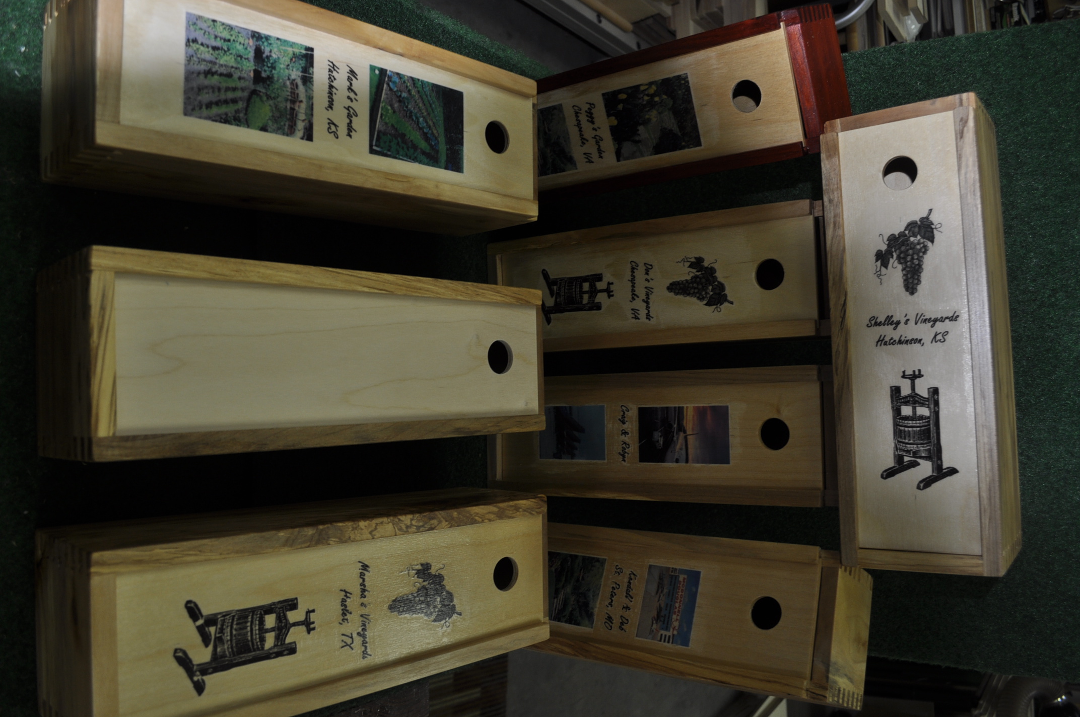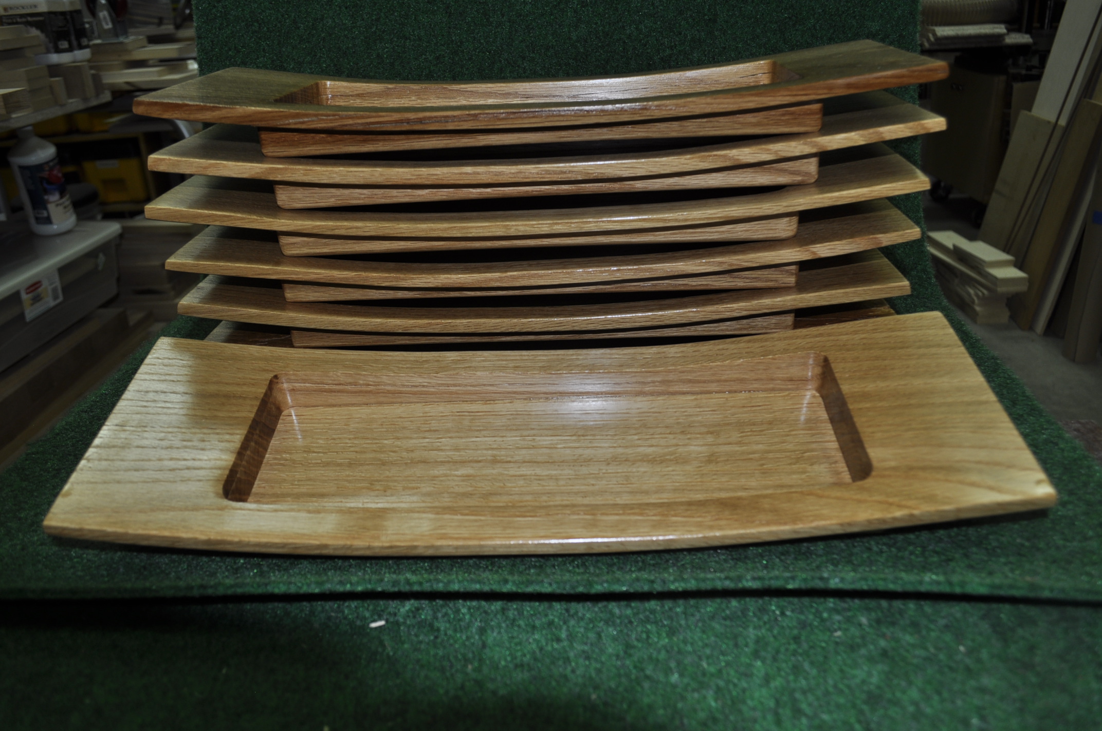 Guild Woodworking ProjectsOur first project for this month’s 2021 newsletter comes from Russ Palmer as he is building his “L” shaped cabinets for his garage workshop. Garage Workshop Cabinets I’ve finally started the cabinet project for my garage/workshop. I wanted more drawers for better organization for future projects. I used full extension drawer slides and purposed spaces (thanks to my wife's recommendations) are features of the project. I'm also incorporating a little slot-in-groove for drawer construction. Our next project comes all the way from TWWWG member Bradley Vierkant who is currently stationed in California. Wine Bottle Buffet Table Great news, first I would just like to say thank you for keeping me on the e-mail chain while I have been stationed in CA. I have greatly enjoyed staying in the loop of all that is going on in the guild. I am getting stationed back in VA and will be in the area come June. I understand dues are not due, due to COVID, but I would be more than happy to throw in my fair share when you need it. Hopefully by the time I am back we are in person again, if not, virtual meetings are going strong! I have definitely not been idle with my time here in California and just finished up a large commissioned piece (see pictures below). Everything is made from Solid Red Oak, and Oak plywood. The buffet table holds 25 bottles of wine and measures in at 5 feet across, 19 inches deep, and 39 inches Tall. The large drawer on the right side is made for a 10 gallon trash can. I have 20 Days till my shop is packed up and still have several projects I need to finish up. I look forward to being back with y'all! The next projects come from Gary Stephens and his woodworking Christmas presents. Customized Wine Bottle Boxes These customized wine bottle boxes were simple to construct for Christmas presents. I used finger or box joints the ends. The wood was splatted River Birch that I had cut 5 or 6 years ago. The lone red colored wine box was made with a left over piece of Paduk. The customization of the front of the box proved to be the most challenging. The image and message were created on my computer and then mirrored in Word so that when the transfer was complete the image would not come out backwards, especially the names. The removal of the paper from the wood to show the image and to whom it was made for turned out to be very time consuming but in the end everyone liked their wine boxes. Not something they could go out to the store and buy. Serving Trays