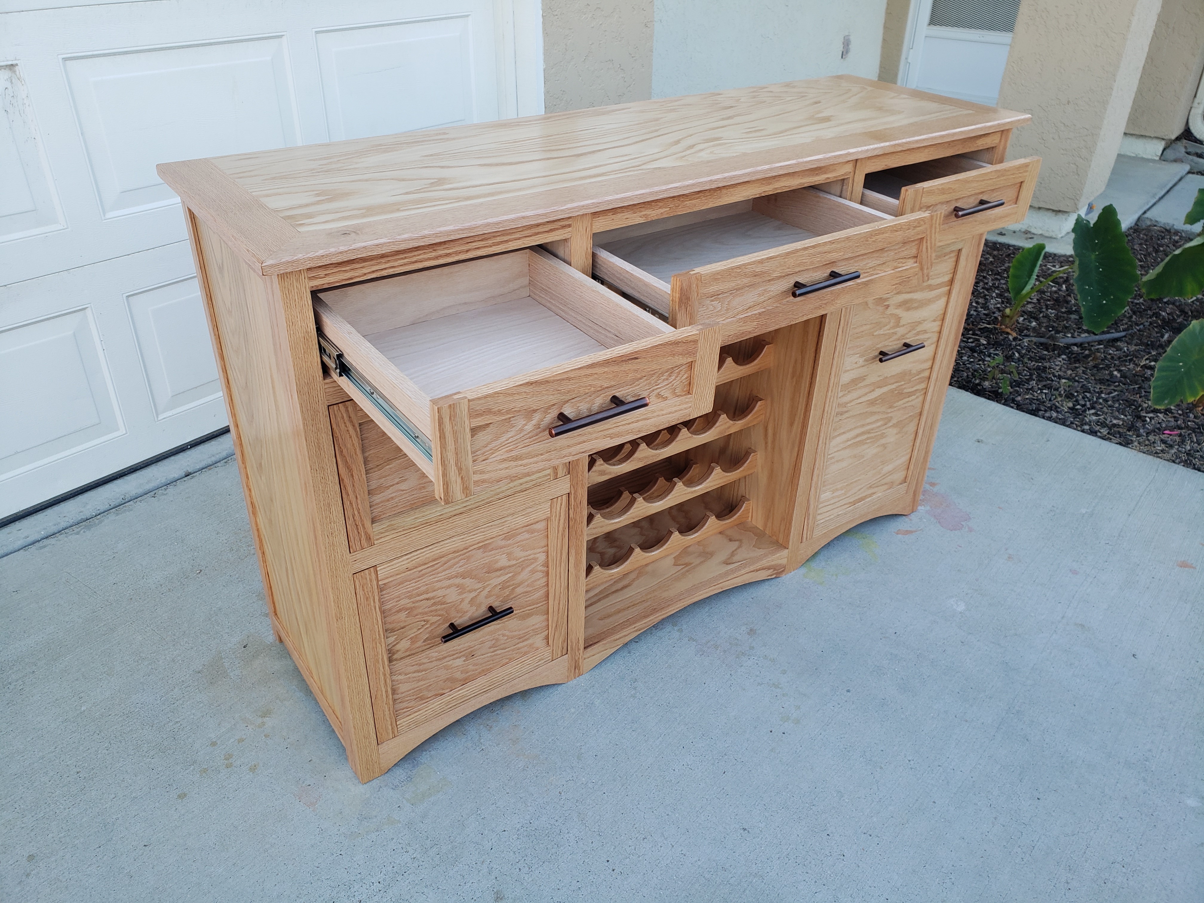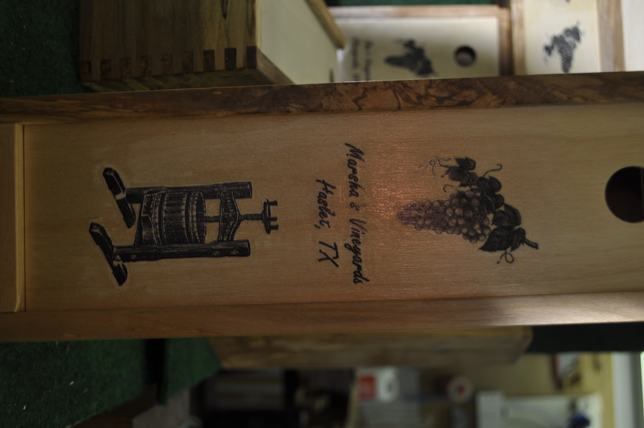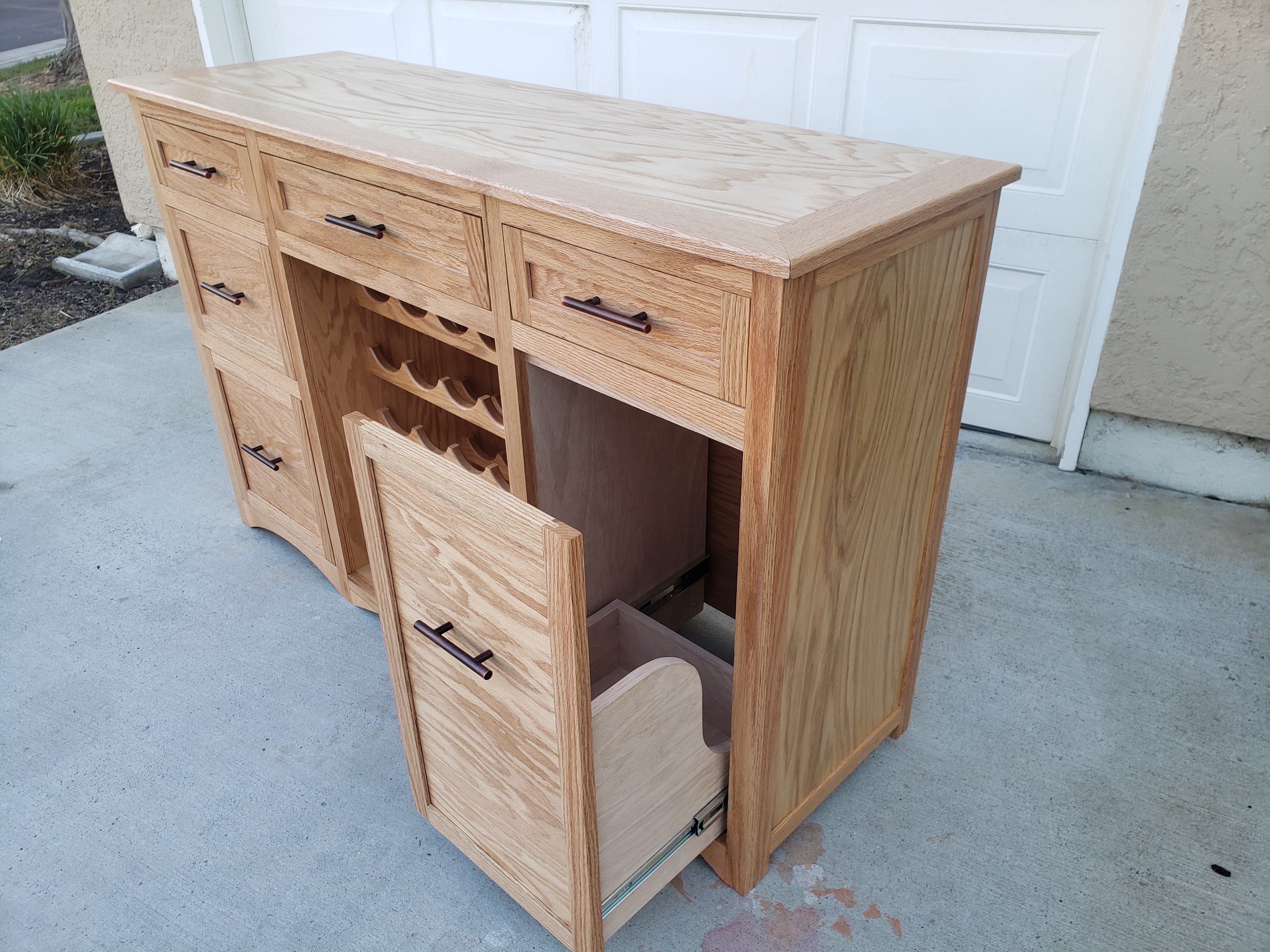 Guild Woodworking ProjectsOur first project for this month’s 2021 newsletter comes from Russ Palmer as he is building his “L” shaped cabinets for his garage workshop. Garage Workshop Cabinets I’ve finally started the cabinet project for my garage/workshop. I wanted more drawers for better organization for future projects. I used full extension drawer slides and purposed spaces (thanks to my wife's recommendations) are features of the project. I'm also incorporating a little slot-in-groove for drawer construction. Our next project comes all the way from TWWWG member Bradley Vierkant who is currently stationed in California. Wine Bottle Buffet Table Great news, first I would just like to say thank you for keeping me on the e-mail chain while I have been stationed in CA. I have greatly enjoyed staying in the loop of all that is going on in the guild. I am getting stationed back in VA and will be in the area come June. I understand dues are not due, due to COVID, but I would be more than happy to throw in my fair share when you need it. Hopefully by the time I am back we are in person again, if not, virtual meetings are going strong! I have definitely not been idle with my time here in California and just finished up a large commissioned piece (see pictures below). Everything is made from Solid Red Oak, and Oak plywood. The buffet table holds 25 bottles of wine and measures in at 5 feet across, 19 inches deep, and 39 inches Tall. The large drawer on the right side is made for a 10 gallon trash can. I have 20 Days till my shop is packed up and still have several projects I need to finish up. I look forward to being back with y'all! The next projects come from Gary Stephens and his woodworking Christmas presents. Customized Wine Bottle Boxes These customized wine bottle boxes were simple to construct for Christmas presents. I used finger or box joints the ends. The wood was splatted River Birch that I had cut 5 or 6 years ago. The lone red colored wine box was made with a left over piece of Paduk. The customization of the front of the box proved to be the most challenging. The image and message were created on my computer and then mirrored in Word so that when the transfer was complete the image would not come out backwards, especially the names. The removal of the paper from the wood to show the image and to whom it was made for turned out to be very time consuming but in the end everyone liked their wine boxes. Not something they could go out to the store and buy. Serving Trays