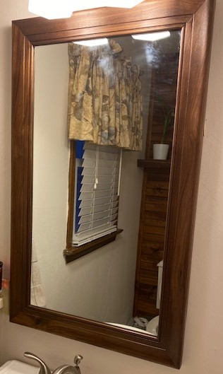 This is a picture I took for a customers master bathroom. It was built from 1” thick Black Walnut. The profile was cut on my router table with a Freud casing router bit 99-465. After all, four pieces were cut to size the ends were cut to accept a Domino. For those who are not familiar with the Domino system a Domino it is Festool’s version of a of a biscuit. The sides and the top and bottom were cut with a groove to accept ¼” thick mirror. Next rabbets to ¼” thick plywood on the backs of all four pieces. These rabbets are ¼” deep x ¾” wide. Next a dry assembly with the mirror glass was done to verify everything fit properly and a piece of ¼” plywood was cut to fit in the rabbet on the back. Frog tape was applied to the surfaces that see glue and everything was dry assembled with the plywood sheet installed to aid in holding everything together while the entire mirror was sanded and finished. After sanding a few coats of shellac were laid down followed by a few coats of lacquer. After a few days of curing final assembly was done using Old Brown Glue. Frog tape was carefully placed on both sides of the glue joints to capture any squeeze out.. After allowing the glue ample time to cure an aluminum Z Clip (Panel Clip) was installed on the back and the half went to client when mirror was delivered. Everyone was happy and I got paid and I became happy too. That’s all for now folks.