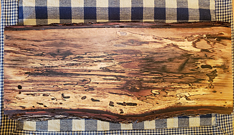 Project 17 for the year is a natural edge spalted oak charcuterie board. This one has a name: Wormwood. The 16 x 8 x 1 board is made from scrap left over from the milling of a large branch. It is pocked with boring holes from insects, each reamed and cleaned before being filled with clear resin/epoxy and then soaked in mineral oil and polished with beeswax/oil 'board butter. This would be an eye-catching addition to the kitchen of anyone who appreciates the endless beauty of wood. Project 18. This is a 12 x 5 x 3/4" cheese slicer made from a twisted scrap of quarter-sawn red oak. It had a number of large intrusions that I filled with resin/epoxy and polished to a transparent view.
